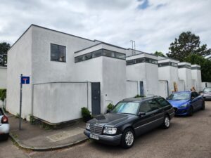 この住宅展覧会では、21週間という短期間に17人の建築家が設計した21戸の住宅が建てられました。現在は11戸の住宅が残っています。美術館を出て、このあたりを歩くと、オランダのJ.J.P.アウト(1890~1963)が設計したタウンハウス(下の上段写真)、ドイツのハンス・シャロウン(1893~1972)の戸建て住宅(下の下段写真)などを見ることができました。いずれも96年前に建てられたものとは思えないモダンな建築物で、まさにポルシェ64の住宅版だと思いました。