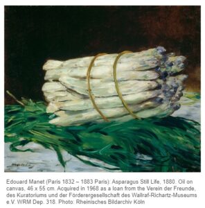 メロンなどと競うのですから、ローマ時代と比べれば大出世です。同書(3巻)で、食材の域を超えた「空間におけるフォルムの勝利者」と評されたのは、エドゥアール・マネ(1832~1883)の「アスパラガスの束」という絵画でした。たしかに写真を見ると、おいしそうという感想の前にシュールだね、と言いそうです。とはいえ、この絵を収蔵しているのはドイツ・ケルンのヴァルラフ・リヒャルツ美術館ですから、地元の鑑賞者は、この絵を見て、今晩の食卓はこれ、と決めているかもしれません。