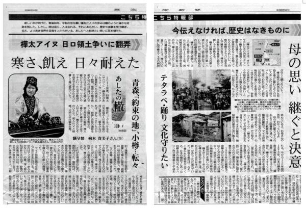 東京新聞の記事によると、樺太・千島交換条約によって、樺太アイヌ800人余は日本への移住を余儀なくされ、一時は宗谷に、その後は対雁(ついしかり、現江別市)に移されました。日露戦争で南樺太が日本領になると、ほとんどの樺太アイヌが樺太に戻り、太平洋戦争の前には1000人を超える樺太アイヌが暮らしていましたが、戦争末期のロシアの侵攻で、再び北海道に移住することになりました。樺太アイヌの戦後の入植地となったのは、宗谷に近い稚咲内(わかさかない)で、そこはアイヌ語で「飲み水がない川」の意で、水に恵まれないこともあり、入植者はさらに移住を迫られたとあります。まさに「流浪の民」となることを強いられたのです。