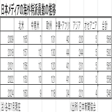 ボーン・上田賞のことを取り上げて、ふと気になったのが海外特派員の数の変化です。経費節減のため、新聞社や通信社は特派員数を減らしているのではないかと想像しながらデータを見てみました。