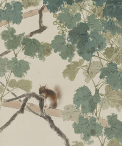 同館の野地耕一郎館長によると、櫻谷は、新しい岩絵具を使ったり、絵具を厚く塗る技法を考えたり、多彩な洋画を意識しながら新しい日本画を描こうとしました。たしかに、果実を頬張るリスを描いた「葡萄栗鼠」などを見れば、静的な日本画に動的な洋画のリズムを取り入れることに腐心したように思われます。(下の画像は、木島櫻谷《葡萄栗鼠》大正時代 泉屋博古館東京)