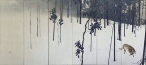 「寒月」は、来年6月から同館で展開される「生誕150年 木島櫻谷」で展示されることになっていますが、その画像を見ると、月に照らされた雪の竹林を歩く狐の様子が動的に描かれていて、素人目にもすばらしい作品だと思います。漱石が「写真屋」とけなしたのは、写実主義に走っているように見えた櫻谷の姿勢に納得できなかったのでしょう。日本画が洋画に圧倒されそうな時期、櫻谷らは、洋画の技法などを取り入れながら、日本画の刷新を図ろうとしていました。漱石は、そうしたあがきに対して、西洋美術と東洋美術は違うのだから、もっと自信を持てと言いたかったのかもしれません。(下の画像は、木島櫻谷《寒月》大正元年(1912)京都市美術館、上は屏風の左、下は右)