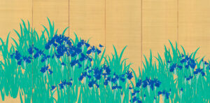 目を引いたのは、「燕子花図」や「竹林白鶴」など二曲一双の屏風です。燕子花(かきつばた)といえば、教科書に出てくる江戸時代の尾形光琳(1658~1716)の作品が有名ですが、櫻谷の作品は色が鮮やかで、初夏のさわやかさを感じさせます。(下の画像は、木島櫻谷《燕子花図》大正6年(1923)泉屋博古館東京、上は屏風の左、下は右)