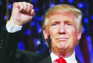 ◎大統領選で当選を決め、ガッツポーズをするトランプ氏=ロイター・共同